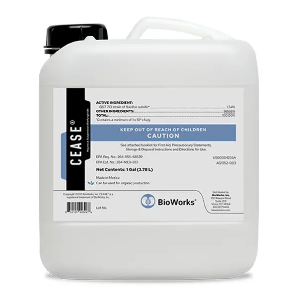 CEASE is a contact biological fungicide containing a patented strain of the bacterium Bacillus subtilis which works in two ways. First, the bacterial spores occupy space on the plant surface and compete with the pathogens; then active compounds called lipopeptides produced by each bacterium disrupt the germination and growth of invading pathogens. Due to this action, resistance is not likely to develop. CEASE can be used in combination with and/or in rotation with other products and as part of an effective resistance management program.